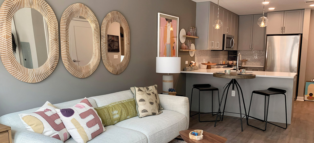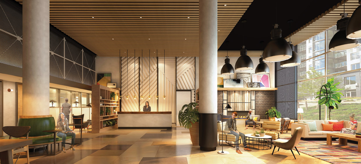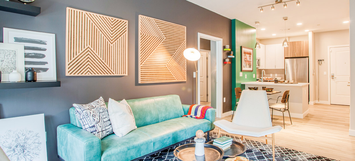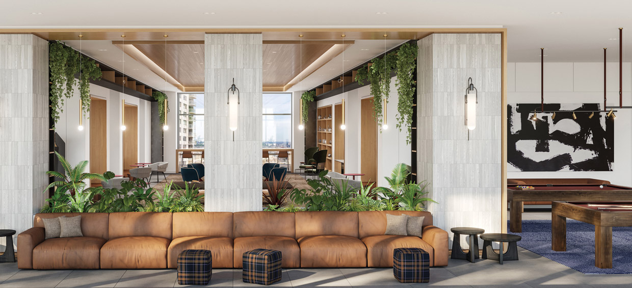 The building is complemented by a full suite of amenities, 25,000 square feet of retail and covered public parking. Designed for the discerning modern renter, the residences feature luxury plank floors, quartz countertops with full-height backsplashes, kitchen pendant lighting, state-of-the-art stainless-steel appliances, and other designer-quality fixtures and finishes in the kitchens and bathrooms.