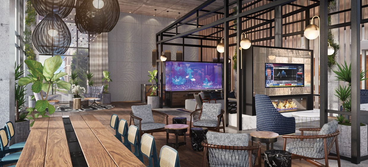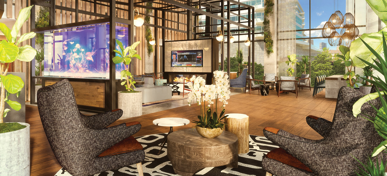 Lastly, the lobby uniquely features a custom jellyfish tank, which will be home to moon jellyfish – a first across our multifamily portfolio.