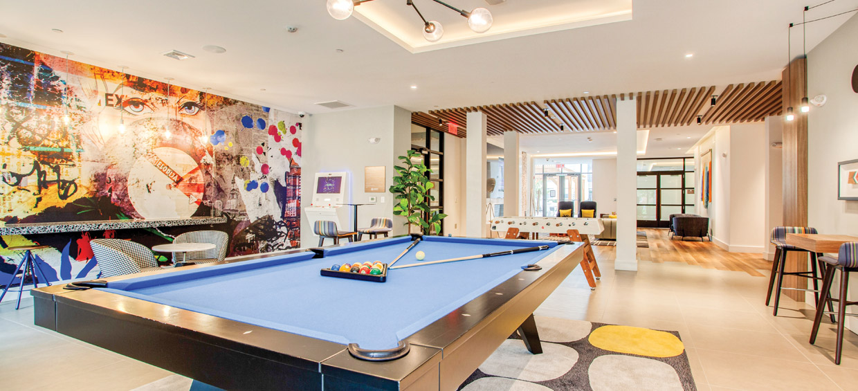 The property also offers a fantastic suite of amenities, including resort-style outdoor pool, outdoor ping-pong and billiards, clubroom with billiards, entertainment space, golf simulator, state-of-the-art fitness center, yoga and spin room with Fitness On Demand™, conference room & game lounge, private study rooms, shuttle service, garage parking, dog wash studio and package concierge.