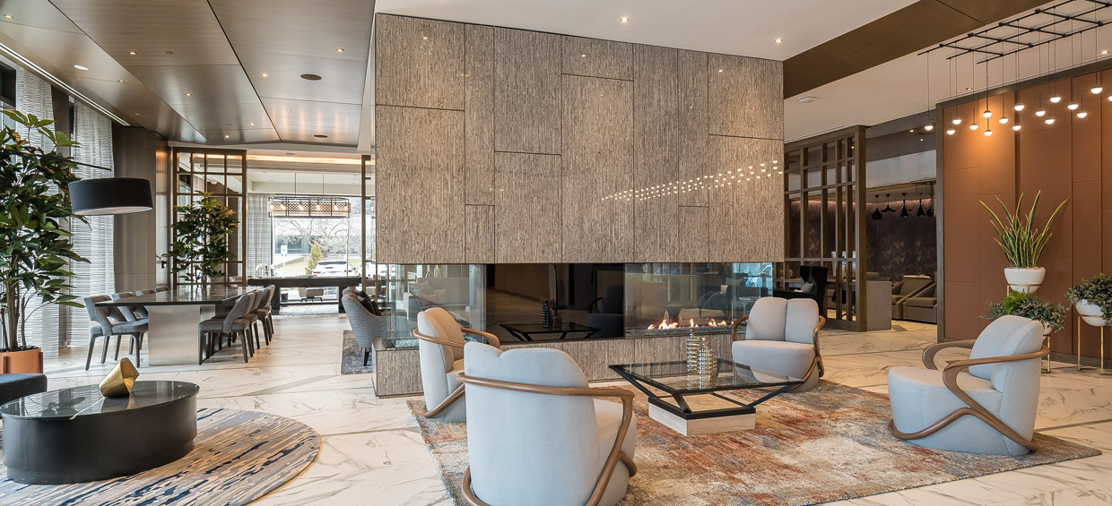 Amenity spaces include three resort style courtyards with intimate settings, firepits, outdoor dining and views of the Canoe Brook Country Club golf course. Inside, shared spaces include: a large resident clubroom with a feature fireplace, coffee bar, and billiard lounge; a private dining room and intimate wine cellar with private lockers for residents; a state-of-the-art fitness studio complete with Fitness On Demand™, yoga, spin equipment, and PGA Tour golf lounge with widescreen simulator; workspaces with private conference rooms; a children’s play room; and an expansive, resort-style pool lounge that opens out to a pool deck. Additional lifestyle amenities include underground parking, a full-time dedicated staff, concierge, and valet dry-cleaning service; 24-hour parcel center with storage lockers; an exterior enclosed dog play area; and bike storage.